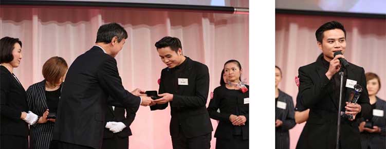 在接受了社长的颁奖后,他激动地说:“很高兴拿到这个奖项!感谢公司提供这样一个展现自我的平台,感谢教育老师的培训指导。我会带着这份荣誉,用我掌握的彩妆技术,用心在店铺为广大中国女性服务,让更多的顾客喜欢上KATE,变得更加美丽自信时尚!”。